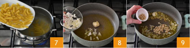 Move to the stove and put the pot on the heat where the pasta will be cooked when it's boiling, so you can salt it to taste 7. In the meantime, place a large saucepan, and prepare the dressing, let the garlic clove and onion sizzle for a minute over low heat 8. Then pour in the pine nuts and let them toast for a minute as well 9.