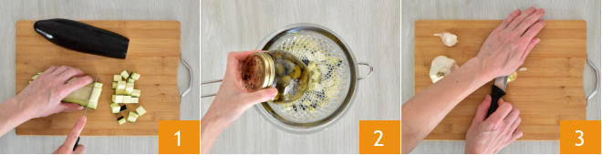 To prepare pasta with eggplants and tuna, start by washing and drying the eggplants. First, slice them, then cut them into strips, and finally into cubes of about 3/4 inch 1. Sprinkle the eggplants with some coarse salt (without overdoing it). Place a plate with a weight on top and let them purge for at least half an hour 2. Before using them in the recipe, remember to rinse them thoroughly and pat them dry. Crush the garlic with the flat side of a knife 3,