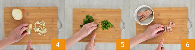 clean and finely chop the onion with a knife 4, finely mince the parsley 5, and finish by crumbling the drained tuna fillets with a knife 6.
