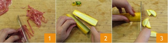 To make the pasta with yellow zucchini cream and prosciutto, first put a pot filled with water on the stove to boil and salt it; this will be used for cooking the pasta. Meanwhile, cut the slices of prosciutto into strips 1. Wash the zucchinis, trim them, then cut them in half 2 lengthwise and then slice them 3.