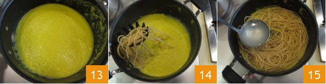 Until obtaining a purée 13. When there are about 5 minutes left for the pasta to cook, drain it directly into the zucchini sauce 14, stir, add a ladle of pasta water, and continue cooking 15.