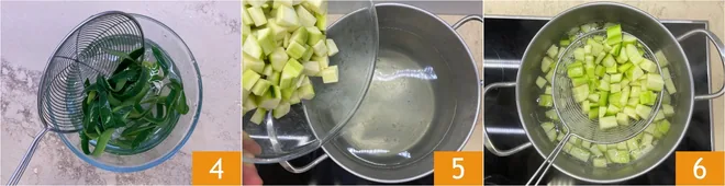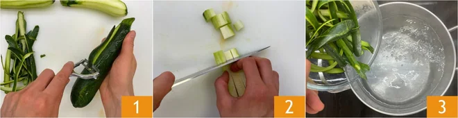 Drain the peels in ice water 4, then blanch the zucchini pulp in the same water for 2 minutes 5. Drain 6 and keep the cooking water aside as you will need it to cook the pasta.