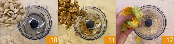 Set the shrimp aside and start making the pesto: place the almonds 10 and walnuts in a food processor 11 and blend until powdered, then add the zucchini flowers 12.