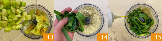 Also add the blanched zucchinis 13 and blend again. Now add the zucchini peels 14 and the oil 15.