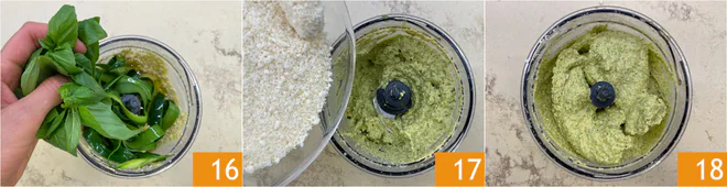 Add the basil leaves 16 and blend again. Finally, add the grated Parmigiano Reggiano 17 and blend one last time to get a thick and creamy pesto 18. Adjust with salt and transfer the pesto to a large bowl.