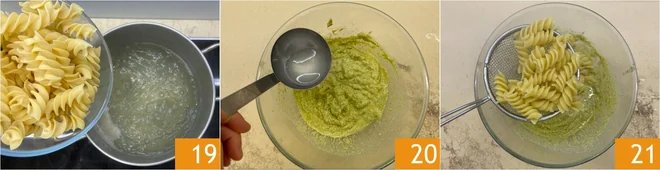 Bring the zucchini cooking water back to a boil and cook the pasta until al dente 19. Meanwhile, thin the pesto with a ladle of the cooking water 20. Drain the pasta into the bowl with the pesto 21 and mix to combine.