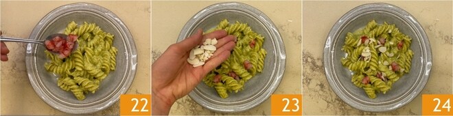 Plate the pesto pasta, topped with raw shrimp 22 and sliced almonds 23. Your pasta with zucchini and zucchini flower pesto with shrimp is ready to be served 34!