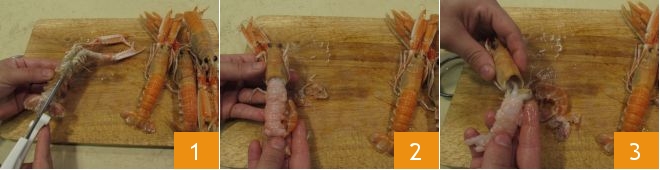 To prepare the pasta with zucchini cream and shrimp, start by cleaning the shrimp: use scissors to cut the shell 1 to easily remove the carapace 2, remove the head 3