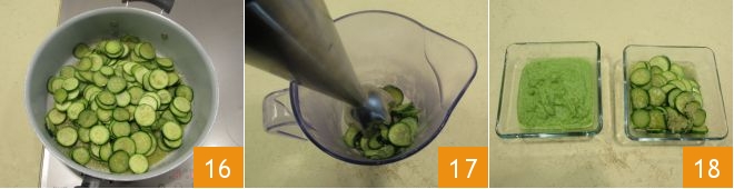 when cooked 16 turn off the heat and take ¾ of the zucchini 17 place them in a blender cup and blend with an immersion blender to obtain the cream 18.