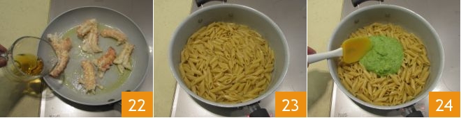 deglaze with brandy 22 and let it evaporate, cook the shrimp for 3-4 minutes at most. When the pasta is al dente, drain it and put it back in the pan where you cooked the zucchini 23, add the zucchini cream 34 and mix to flavor it.