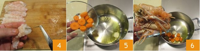 Then use kitchen tweezers to gently extract the intestine, or the black filament found on the back 4, set aside the cleaned shrimp and their scraps, which will be used to prepare the stock. Then prepare the fish stock: in a pan, heat 25 grams (about 2 tbsp) of olive oil with a clove of garlic peeled and halved, add the peeled and sliced carrot 5 and then pour in the heads and shells of the cleaned shrimp 6, sauté everything for 5 minutes.