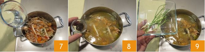 Cover the fish scraps with water 7, add the peppercorns 8 and parsley stems 9. Cook over moderate heat for at least 20 minutes.