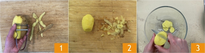 To prepare sticky potatoes, first wash them under water, then peel them 1 2. Next, cut the potatoes into fairly thin round slices, about 1/8 inch 3. You can slice them with a knife or a mandolin.