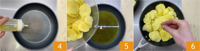 At this point, take a high non-stick pan that's not too wide (in this case, the more the potatoes are piled and overlapped, the better!) and pour in plenty of oil 4. The amount of oil should be enough to fully cover the bottom of the pan, reaching about 1/2 inch in height. An important consideration is that the potatoes should not be completely immersed in the oil, as with fried ones. Heat the oil in the pan, then add all the potatoes 5 and season with salt 6. Cook over high heat.