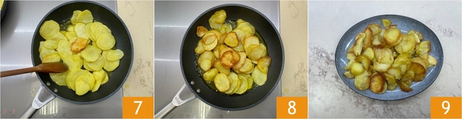 After a few minutes, shake the pan, then with the help of a spoon, gently turn the potatoes over 7. To avoid breaking the potatoes too much, it's important not to stir too often, but rather every few minutes. Cook for about 25 minutes until the potatoes are cooked 8. Then drain them from excess oil and serve 9.