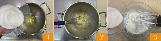 To prepare the pavlova with chantilly cream and berries, start with making the meringue shells. In a double boiler, work the egg whites with 150 g of granulated sugar 1, stirring with a whisk 2 by hand until they reach 113°F. Remove from heat, add the remaining 150 g of sugar, and beat with electric whisks 3. Then add the shredded coconut and mix with a spatula from top to bottom.