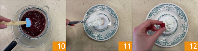 Pass the obtained puree through a fine sieve to make it smooth 10. You can assemble your pavlova: on the serving plates place the meringue shell, the chantilly cream in the center 11, and decorate with berries 12.