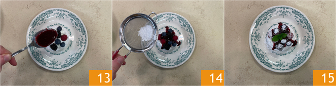 Also prepare the cold berry coulis by blending the berries with lemon juice 7 and powdered sugar 8 9.