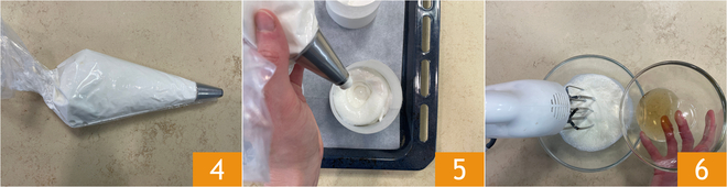Once completed, place the mixture in a pastry bag 4. Take a baking tray, line it with parchment paper, place the rings also lined with parchment paper, and distribute the meringue to create the bases and the edges, forming a shell 5. Bake in a preheated static oven at 203°F for 8 hours: the baking is gentle and long because the meringue needs to dry gradually. Meanwhile, prepare the chantilly cream by working the fresh liquid cream with vanilla syrup 6 and powdered sugar until it is well whipped.