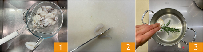 To prepare the pea and cuttlefish risotto, clean the cuttlefish, separate the tentacles from the head 1, remove the part with the beak and eyes, cut the heads in half for a smaller size 2. In a pan, pour a drizzle of oil, a crushed garlic clove, and sprigs of rosemary and sage 3.