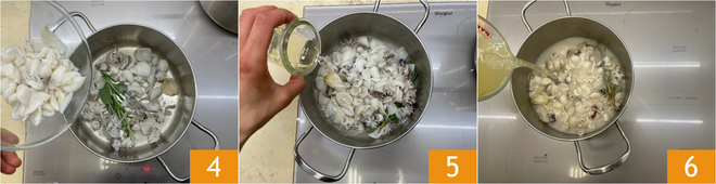 Add the cuttlefish 4, sauté for two minutes, deglaze with 1.4 oz of white wine 5, add a little broth 6.