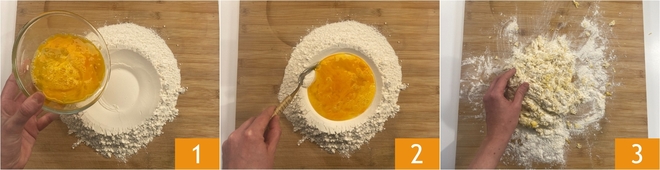 To make the pea ravioli with gorgonzola fondue, start with the fresh pasta: proceed in the classic way, forming a well with the flour and pouring the eggs into the center 1. Begin incorporating the flour into the eggs with a fork 2 and when the dough is manageable continue working it by hand, kneading vigorously 3 without tearing it and folding it frequently for about 10 minutes.