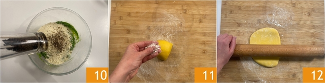 Season with plenty of freshly ground pepper 10 and a little salt, and fold with a spatula to combine. When the mixture is homogeneous, transfer it to a piping bag and set aside. Retrieve the pasta dough. Using a bench scraper, remove about 1/4 of the dough, flatten it with a light dusting of flour on the work surface 11 and then begin to roll it out patiently with a rolling pin 12, turning and stretching it in all directions until you obtain a thin sheet.