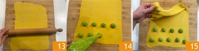 Once you have a sheet about 1–2 mm thick (about 1/32–1/16 inch) 13, on the half closest to you pipe small mounds of filling, spaced a few centimeters apart (about 1 inch) from each other 14. Then fold the top half like a folder over the bottom half 15.