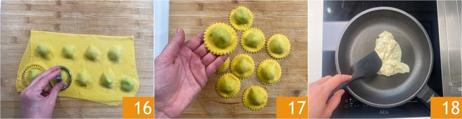 Press well around each mound and then cut your ravioli with a fluted round cutter about 2.5 in (6.5 cm) in diameter 16. Excess dough can be rolled out again after another short rest. Continue like this until all the ravioli are formed 17. In a pan over low heat melt the gorgonzola 18.