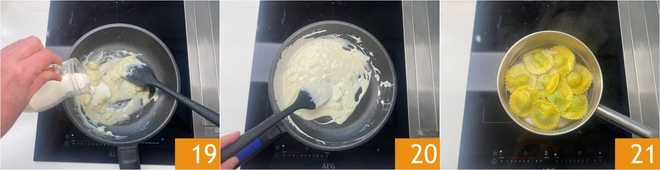 Thin it with heavy cream 19, stir and, once they are well emulsified 20, cook the ravioli in salted boiling water for about 3 minutes 21.