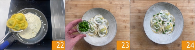 Drain them directly into the pan with the sauce 22, let them absorb the flavors for a moment and then serve the ravioli on plates with the whole peas you reserved 23. The pea ravioli with gorgonzola fondue are ready to be served 34.