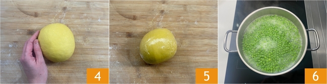 When it becomes smooth 4, cover it with plastic wrap 5 and let it rest for at least 30 minutes at room temperature. Meanwhile, blanch the peas for 6–7 minutes in salted boiling water 6.