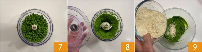 Drain them and cool them in an ice bath to preserve their bright color. Then take one tablespoon aside to use for plating. Put the remaining peas in a food processor 7 and puree them finely 8. In a bowl pour the pea cream and the grated cheese 9.