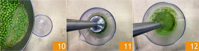 When they are ready, pour half into a tall measuring jug 10 and blend them with an immersion blender 11 to obtain a smooth purée 12. Keep the rest aside for the final garnish.