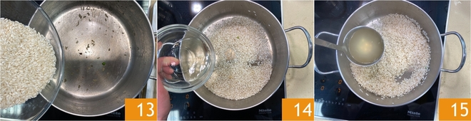 Now move on to the rice: toast the Carnaroli in the same saucepan, without adding fat, for a couple of minutes 13, deglaze with white wine 14 and let the alcohol evaporate. Begin to add the broth gradually 15, stirring often.