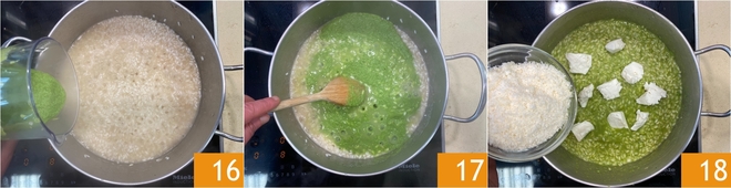Halfway through cooking, incorporate the pea purée 16 and continue until the grain is al dente 17. Once off the heat, finish by stirring in butter and Parmesan 18.