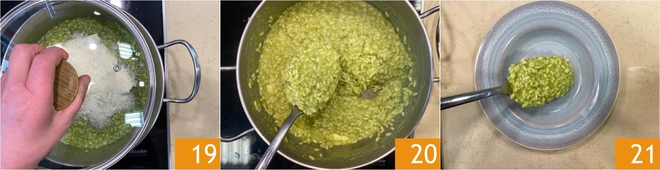 Cover the pan 19, let everything rest for two minutes then stir to combine 20. Finally, plate your risotto 21.