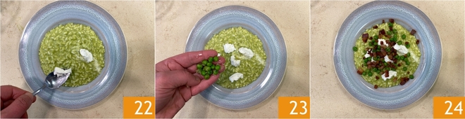 Garnish with dollops of crescenza 22, the reserved whole peas 23 and the crispy pancetta. The pea, crescenza and crispy pancetta risotto is now ready to enjoy 34.