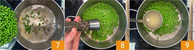 At this point add the peas 7 and let them cook for about seven minutes with a pinch of salt, pepper 8 and a ladleful of vegetable broth (about 1/2 cup / 4 fl oz) 9.