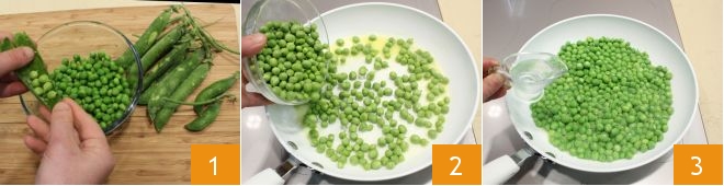 To make the pea roll with prosciutto and sun-dried tomatoes, start by shelling the fresh peas 1, then heat a pat of butter in a pan, add the peas 2 and cook them for 5-6 minutes over medium heat, pouring hot water 3 or vegetable broth as needed to keep them from drying out 3.