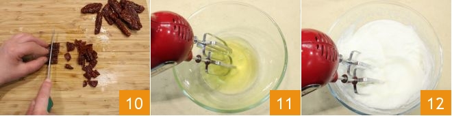 then cut them into small pieces 10, and slice the black olives into rounds. Now handle the omelet, separate the yolks from the whites, and whip the whites to stiff peaks with an electric whisk (11-12).