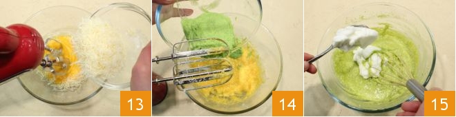 Beat the yolks and also add the grated Parmesan cheese 13. At this point, incorporate the pea cream 14 and lastly the whipped egg whites, folding them gently from bottom to top to avoid deflating them 15.