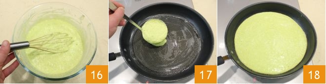 Once you have a homogeneous mixture 16, heat a slightly buttered 13.5-inch pan, pour the batter with a ladle to distribute it better (17-18),