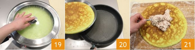 cook with the lid on over medium heat for about 5 minutes, then flip the omelet using the lid itself (19-20) and continue cooking for another 2-3 minutes or until the omelet is nicely golden. Cover it with plastic wrap, and let it cool (this way it will remain soft and easier to roll). Fill the omelet with the prosciutto cream 21