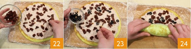 the sun-dried tomatoes 22 and the black olives 23. Roll up the omelet 34,