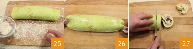 then sprinkle the plastic wrap with grated Parmesan 25 and wrap the plastic wrap around the roll, tightly sealing the ends 26 to ensure it compacts well. Place the pea roll with prosciutto and tomatoes in the refrigerator for at least 1 hour to firm up, then serve it sliced 27 and enjoy it at room temperature.
