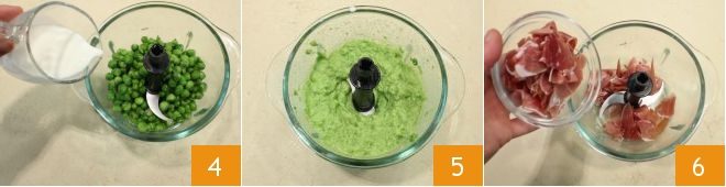 Let the peas cool and transfer them to a blender, add the milk 4 and blend until smooth 5 sieve the cream to remove the pea skin and obtain a smoother mixture. Roughly chop the prosciutto and place it in the blender 6,