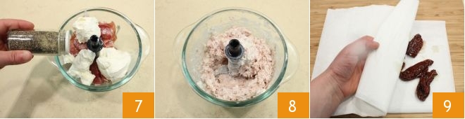 add the Philadelphia 7, salt and pepper, and blend everything to obtain a cream 8. Take the sun-dried tomatoes in oil, drain them, and pat them dry with a paper towel 9,