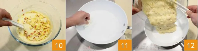 Stir again to combine 10. Now butter a non-stick or ceramic skillet with a diameter of 8.5 inches, with sides tall enough, using a little butter: spread it with the help of a paper towel 11. Heat the skillet over low heat, then pour in the mixture 12.