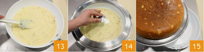 Level it with a spatula to distribute it evenly 13: cook over a very low flame for about 40 minutes with the lid on 14; check now and then to see if it's necessary to flip the cake before the indicated time. After the necessary time, use the same lid to flip the cake to cook it on the other side like an omelet: flip the cake onto the lid and let the uncooked side slide back into the skillet 15.